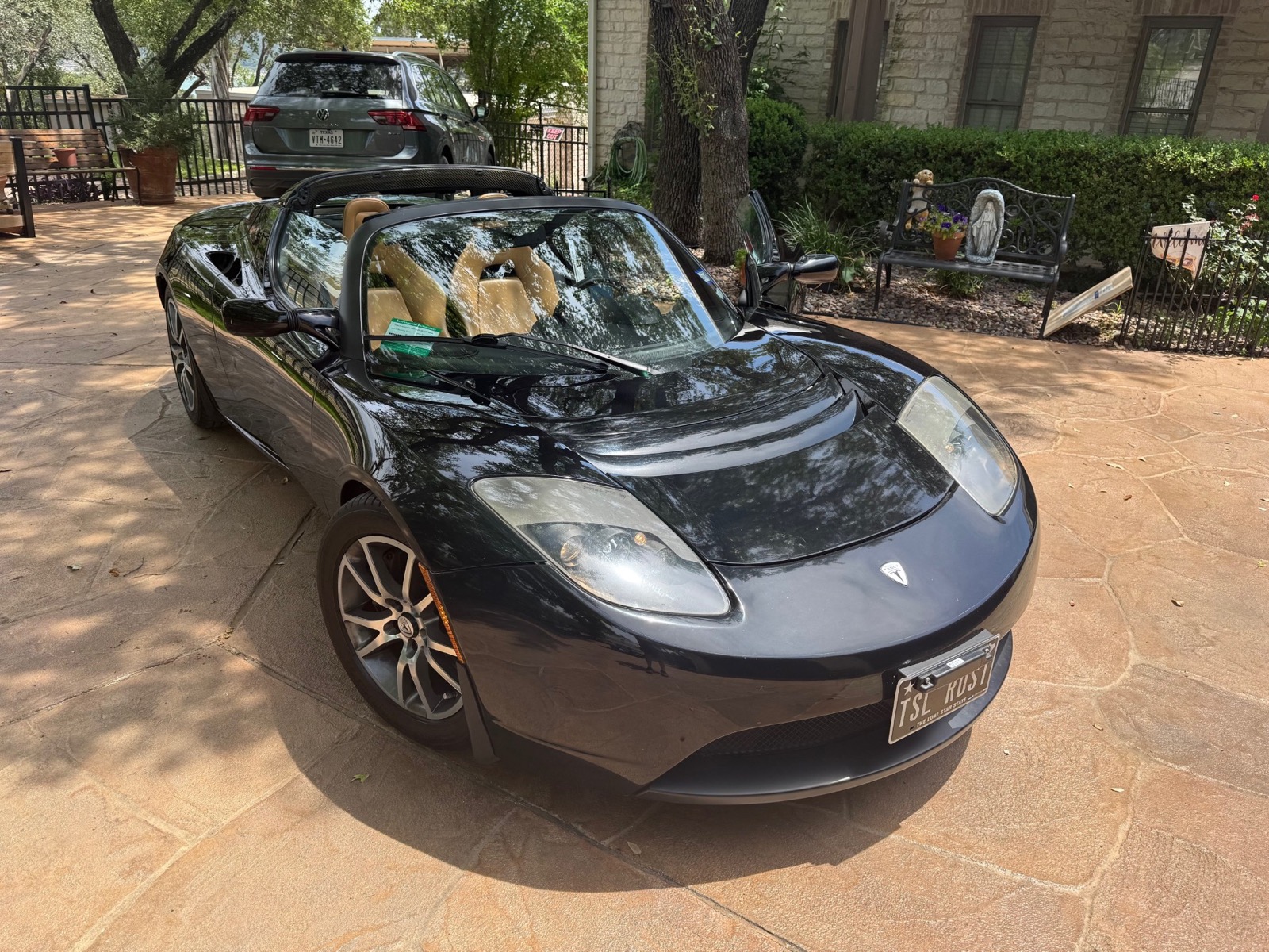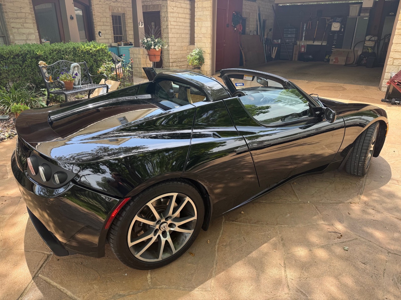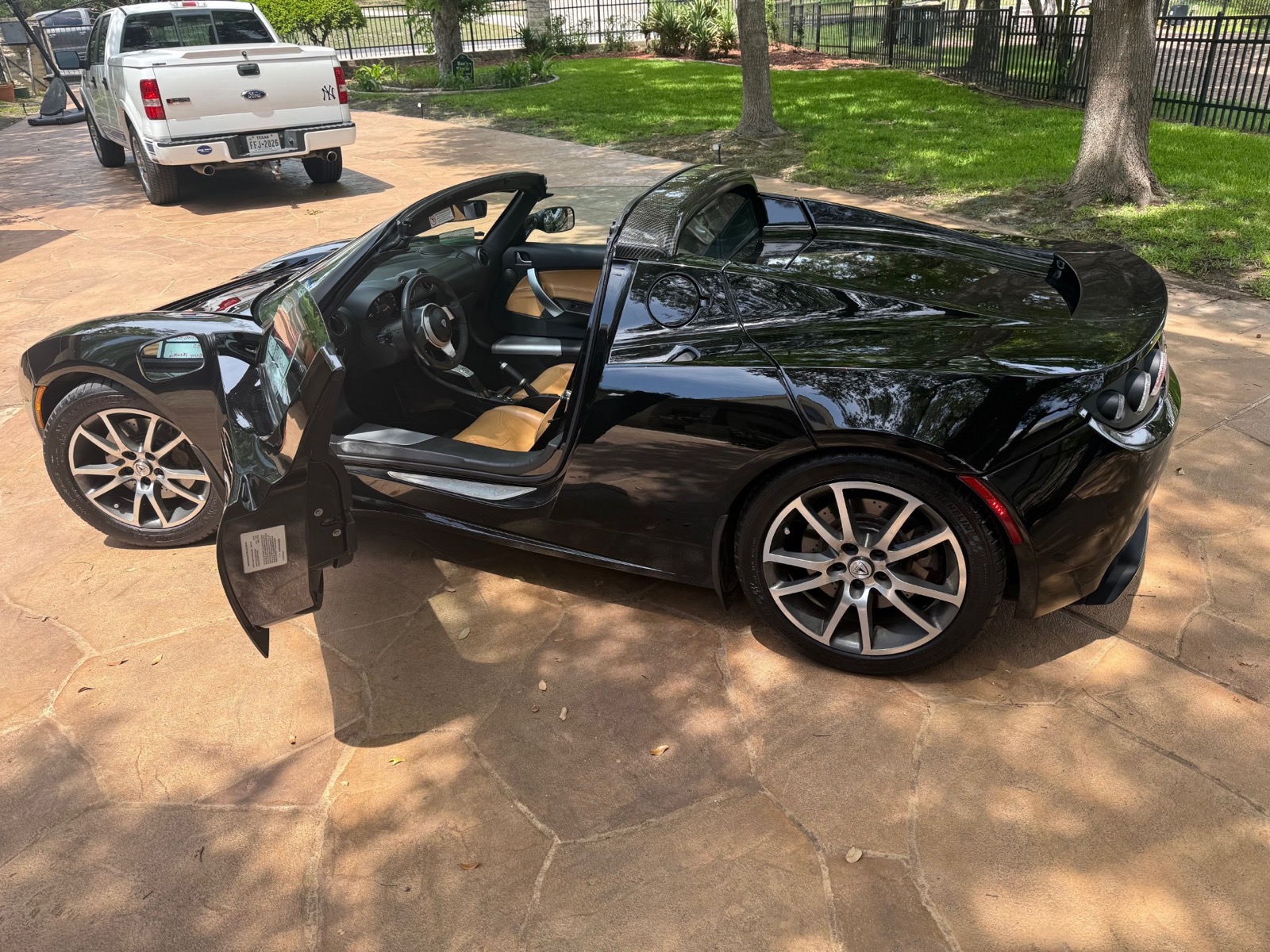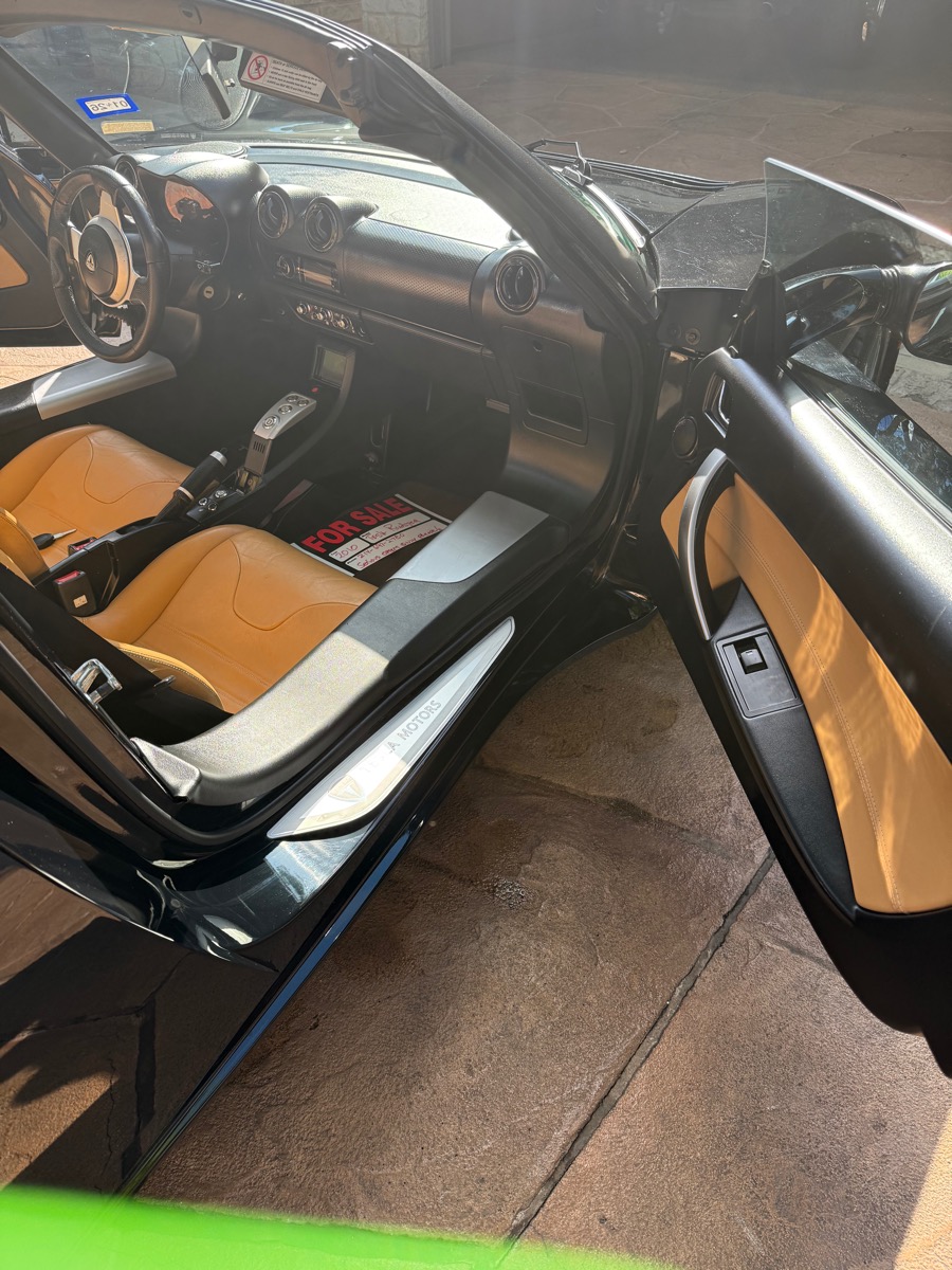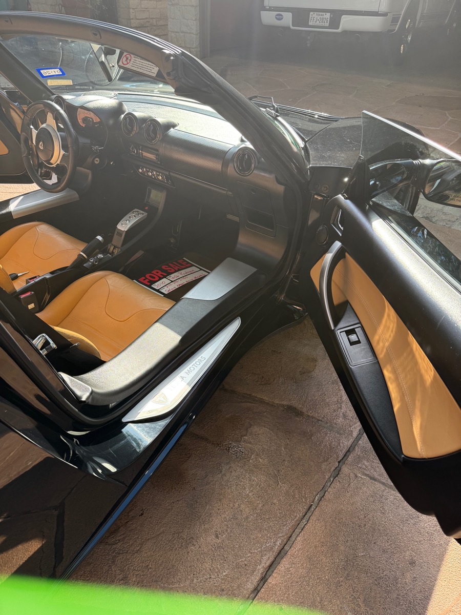 375 volt, 248 HP, air cooled electric motor, single speed automatic gearbox, wheelbase 92.6″ Limited to 2500 production. All electric powered, two seat, open top, rear drive with lithium ion, air cooled, batteries. 0-60 3.9 seconds. Jet Black with Paint Armor coating. Aluminum chassis with for wheel independent suspension. Leather seats, power windows. Solar Guard windshield treatment. Full torque from a dead stop and no engine noise. Solid feel and holds corners extremely well. One owner and a Texas car. Never been driven in snow. Stored in dry facility with a protective cover. Current range is 160-180 miles depending upon circumstances.