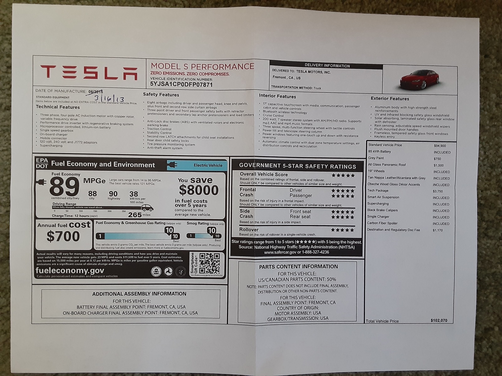 2013 Tesla P85, 18,000 miles – Lifetime free Charging at all Tesla superchargers – informed by Tesla service Department that this particular P85 was one of the best hand-built by the head of the Portland Service Dept. Tech package including Smart Air Suspension, opening glass roof, power lift-gate. No autopilot. New General GMAX tires, Never dogs nor animals of any kind, never smoked anything in, nor eaten food in. From Northen California and Southern Oregon. 100% rust-free everywhere. Always garaged never driven in rain or snow. Gray metallic paint, tan leather seats, alcantara headliner. Beautiful interior. Still has the new car smell. Clean and clear Oregon Title. Will charge up to 250 miles.