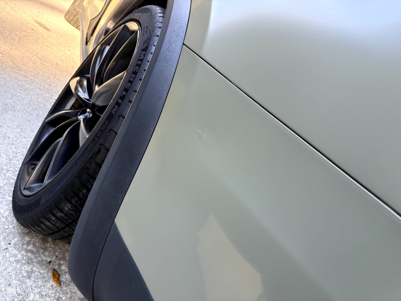 There is one minor cosmetic blemish on the left rear fender (approximately quarter-sized) that existed prior to the wrap. It is documented and shown in photos. Chrome Delete.