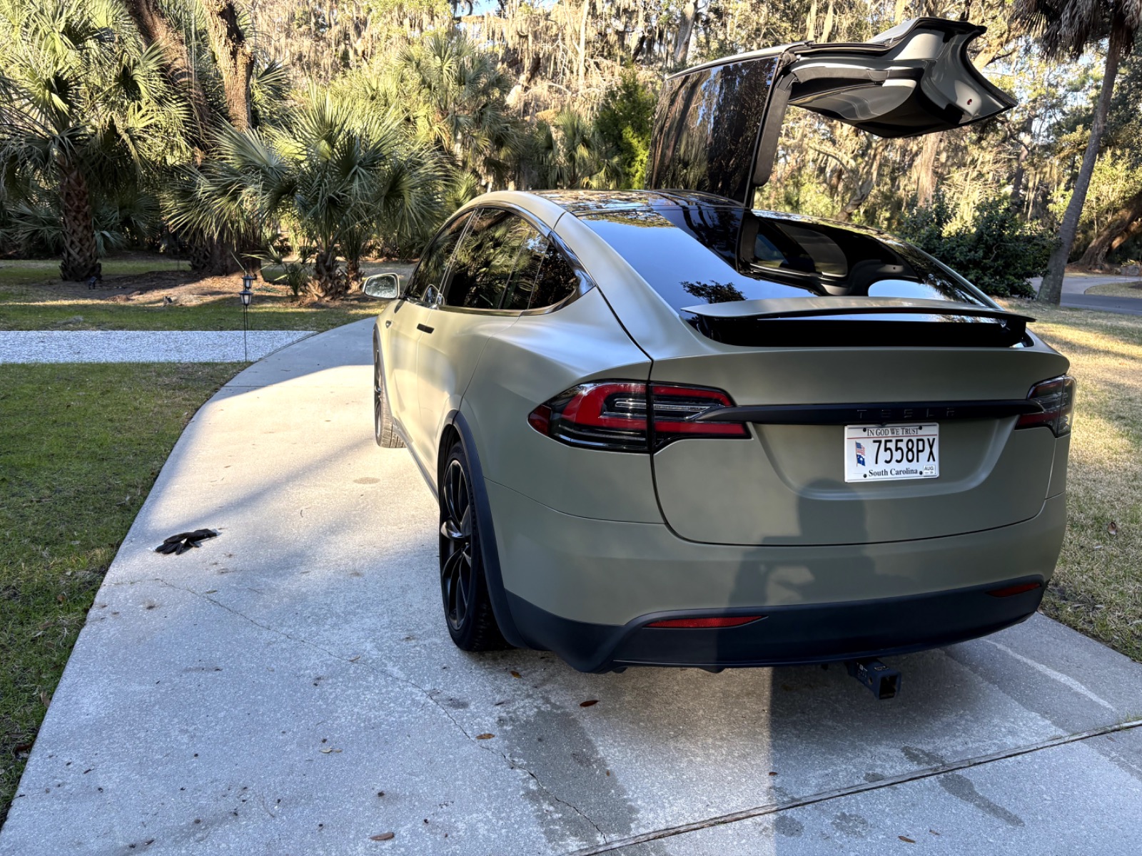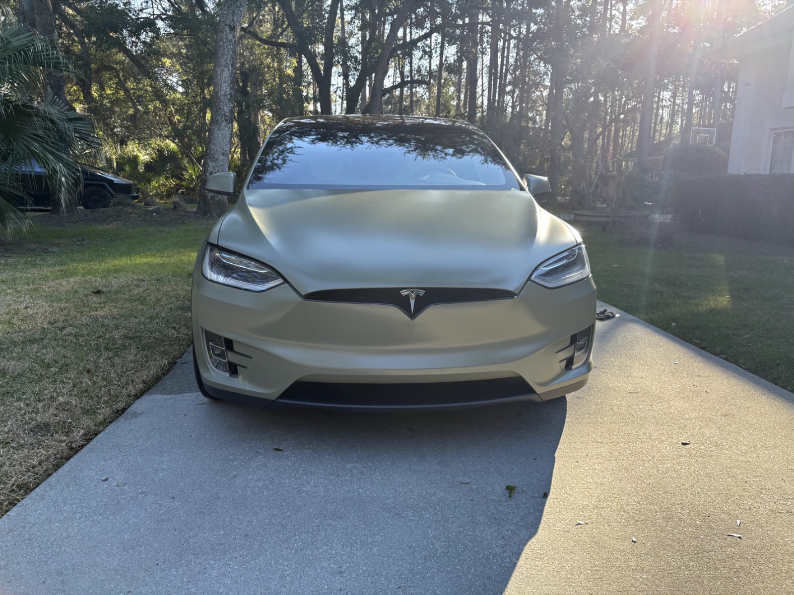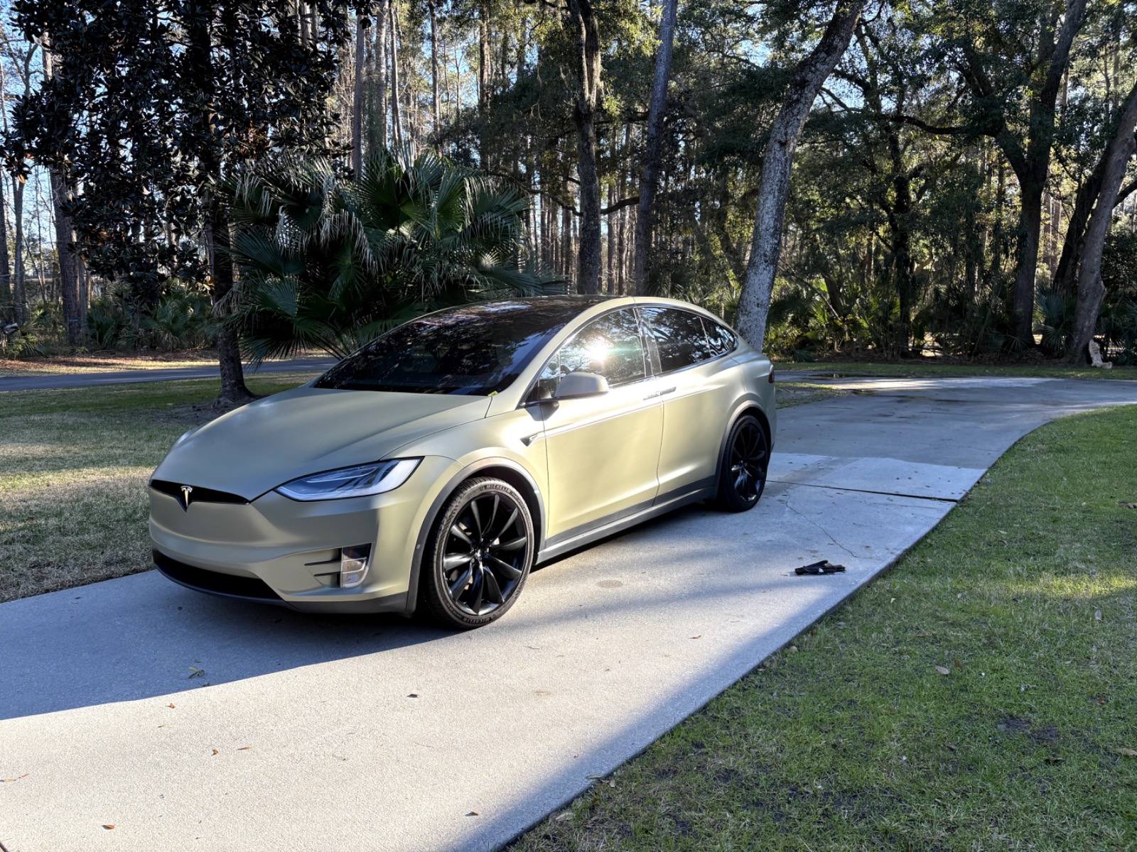 Originally finished in White Pearl, this Model X is professionally wrapped in Matte Olive Green, giving it a distinctive, modern look while preserving the original paint underneath.