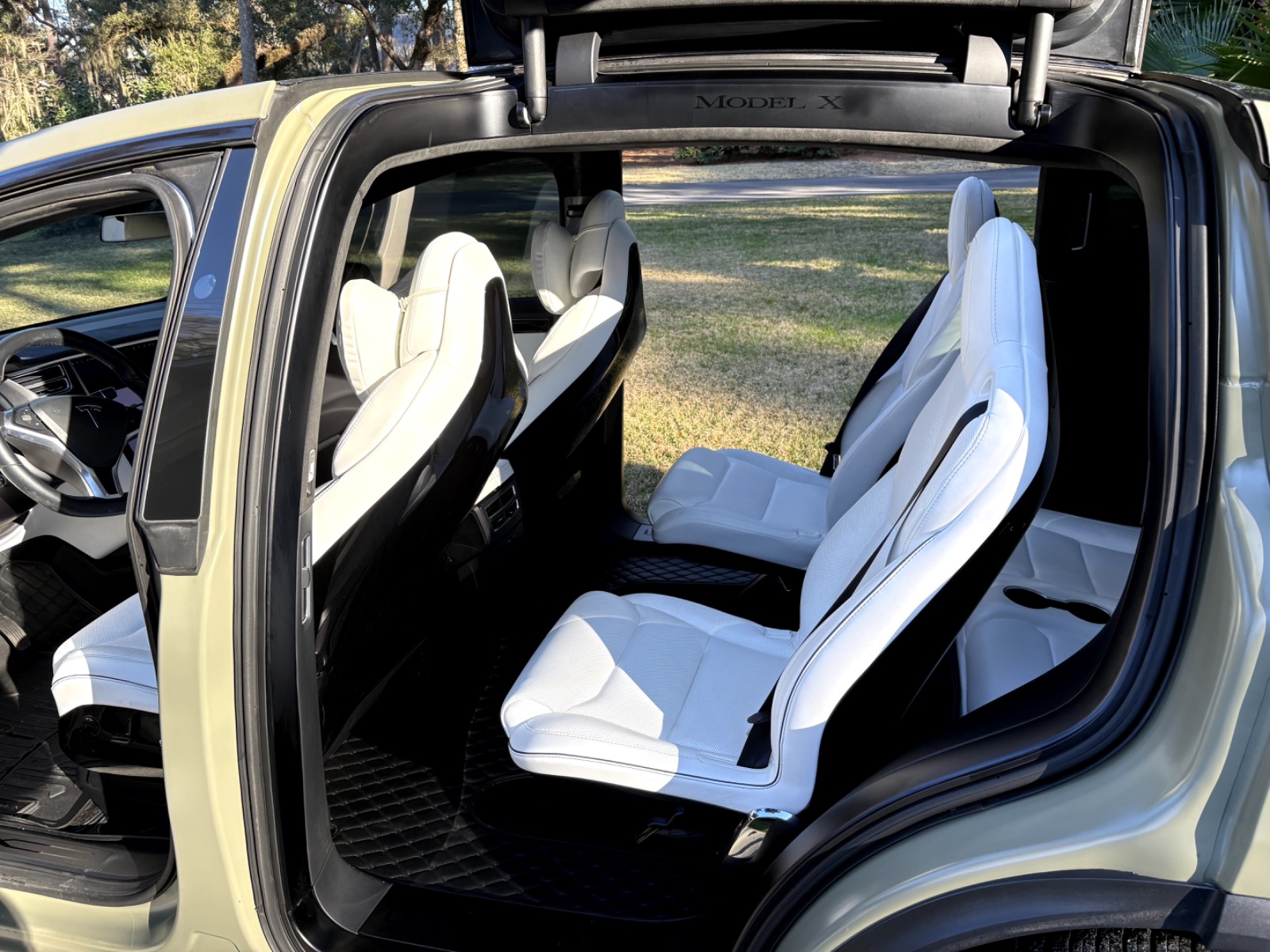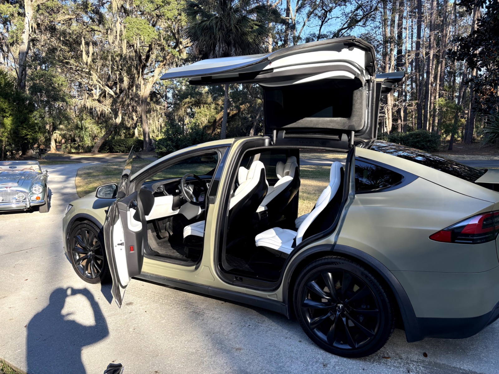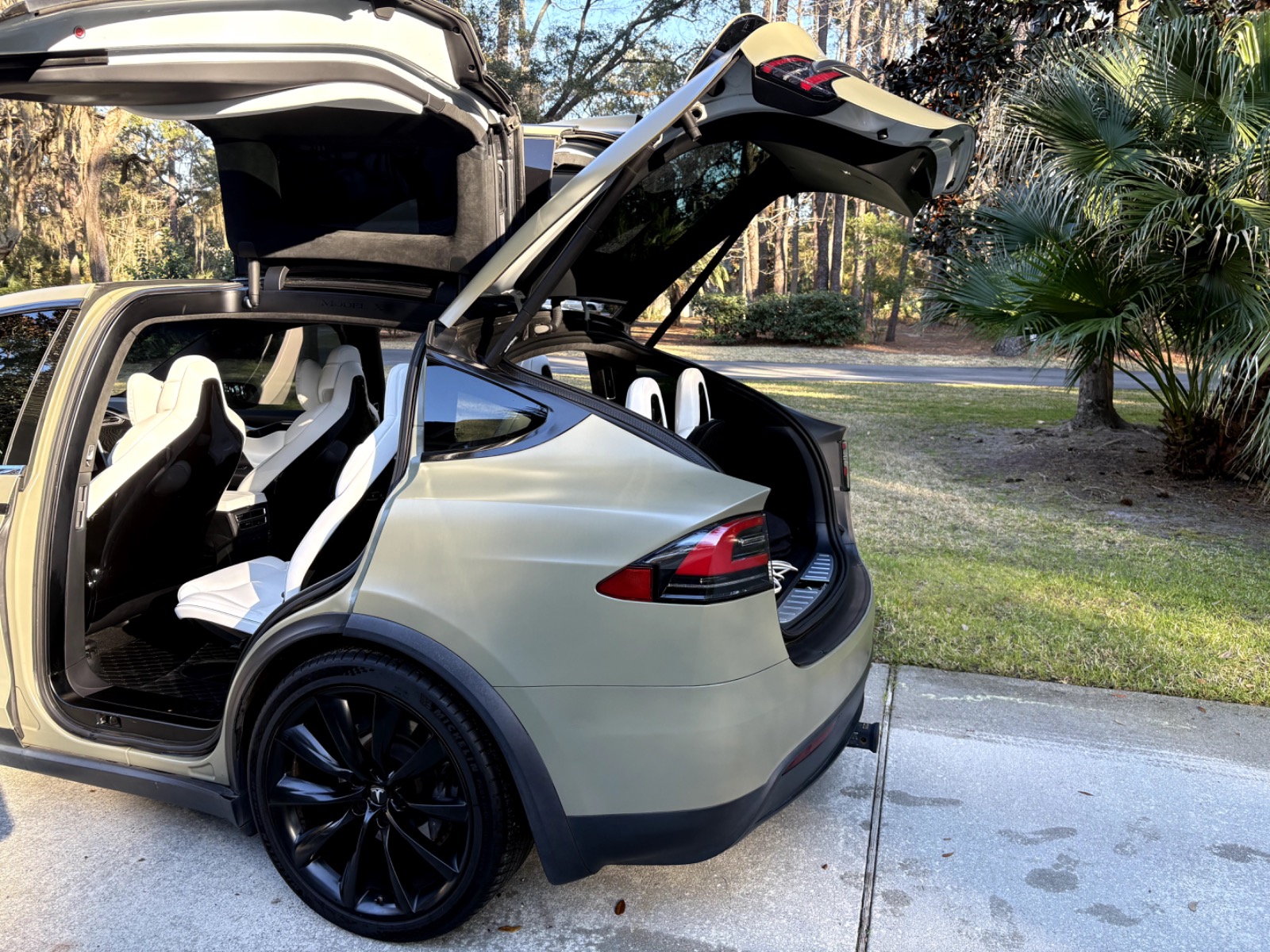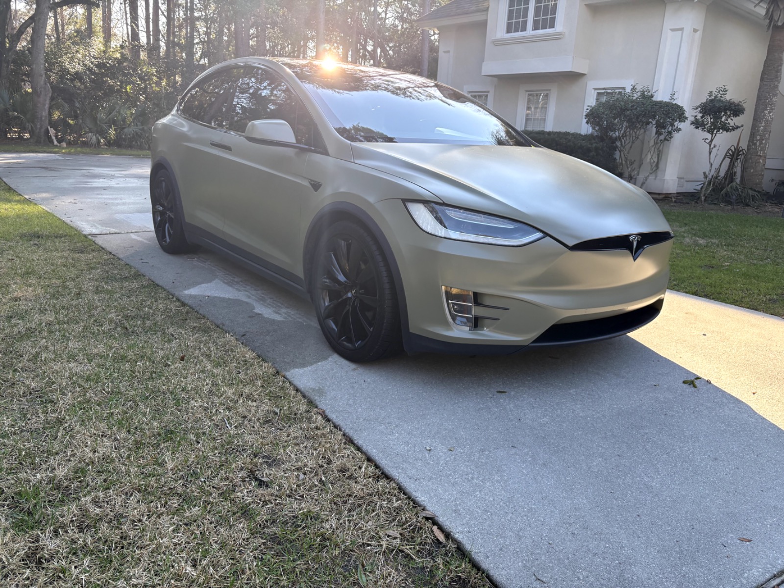 Originally finished in White Pearl, this Model X is professionally wrapped in Matte Olive Green, giving it a distinctive, modern look while preserving the original paint underneath.