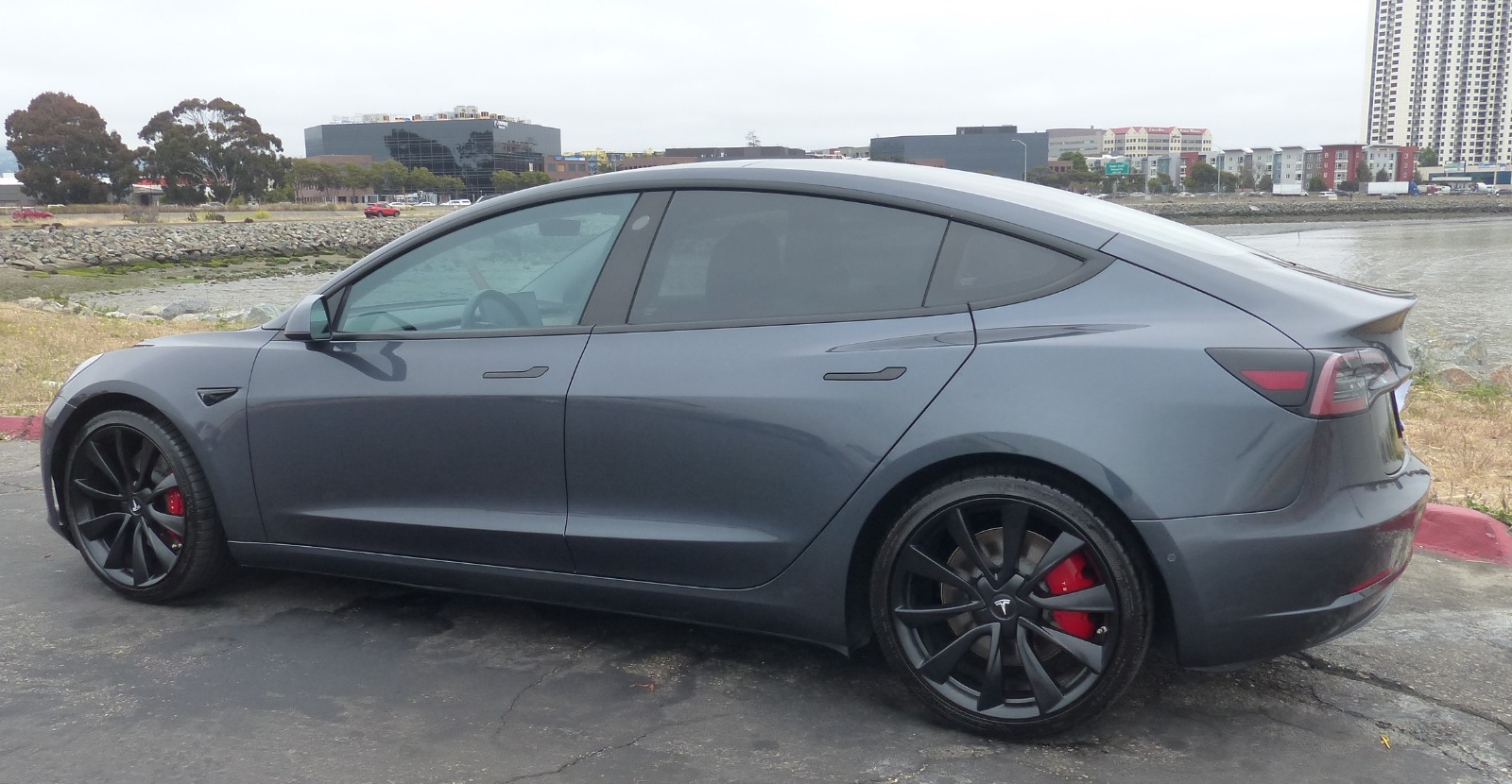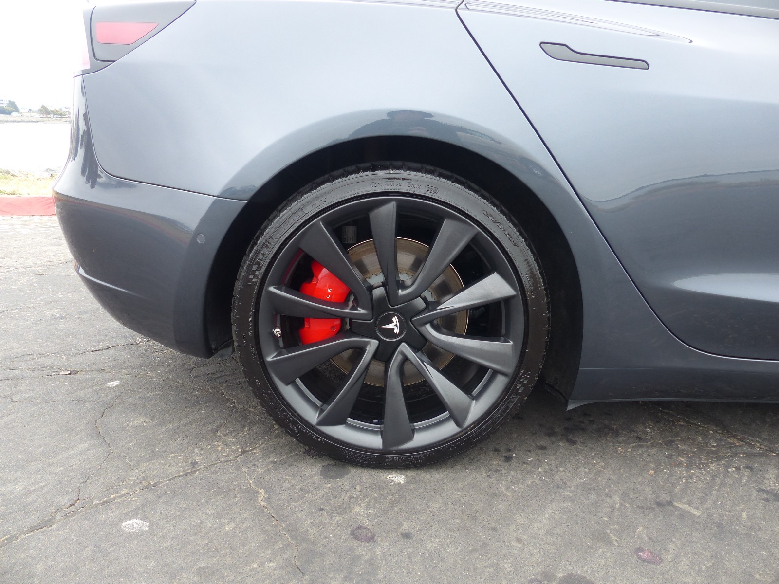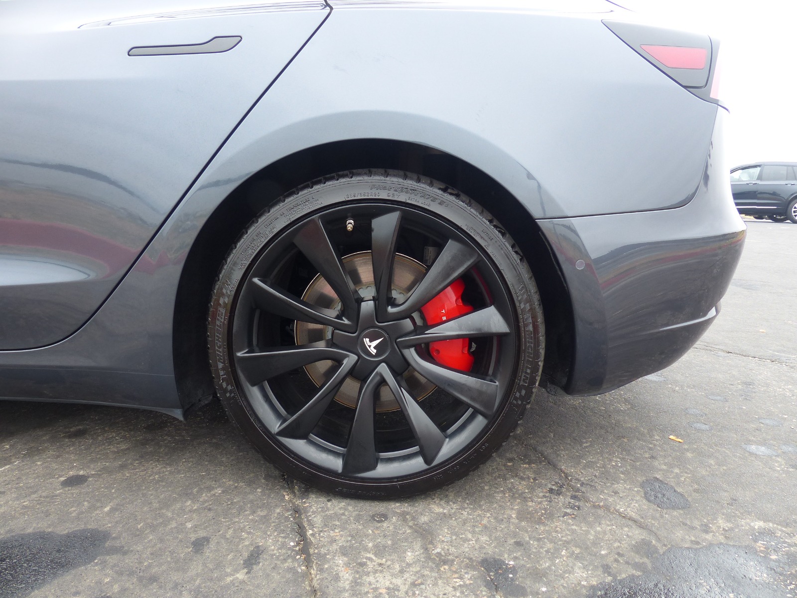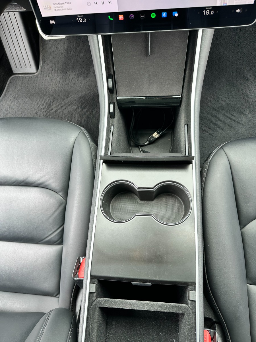 Single owner vehicle with very low mileage and clear title in hand. This is an extremely clean and very well-cared-for vehicle in almost immaculate condition. Unfortunately, there is one small door-ding just behind the rear driver-side passenger door, as shown in pics. Everything else is in excellent condition. Extremely low miles with little battery wear(mostly highway). Very attentive driver and well-taken care of vehicle that has been regularly detailed. Comes with two key cards, a Tesla roof rack(new in the box & never installed), a custom car cover by Evannex, Jeda wireless dual charge pad(installed), 1-TB USB, and has Chrome delete treatment with Window tint(all around) plus interior Tesla glass roof shades. In addition, a complete set of aftermarket sport rim wheels is included in the price. These can be used for track runs or seasonal purposes. These extra wheels are 20″ matte black with mounted tires(Michelin Pilot Sport A/S 3 with <10k miles of wear). Each wheel is enclosed in a separate Tesla tire tote case.