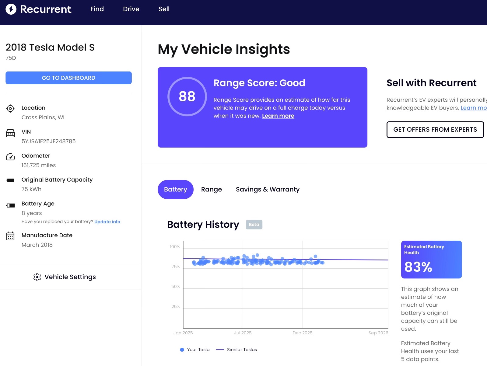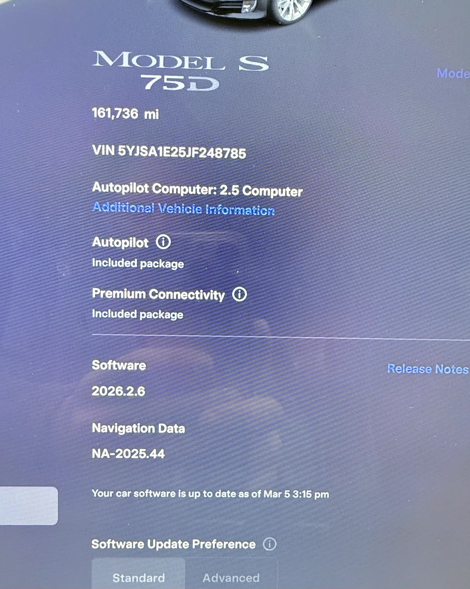 This 2018 Tesla Model S is in fantastic condition. Extremely clean. It has WeatherGuard floor mats in front and back. It includes PREMIUM CONNECTIVITY for audio and video streaming without having to pay $9.99/monthly fee. The Battery and Drive Unit Warranty has unlimited miles and does not expire until April 1, 2026. Includes TWO Tesla Key Fobs I have owned this Model S since December 2024 when I purchased it with 114,000 miles on it for $24,995. I also purchased Autopilot from Tesla for $3,000, as it did not come already installed. Since then, I have replaced the central touch screen, the trunk latch, upper control arms, and had new Michelin Cross Climate tires installed (March 2025). For the last 24,304 miles, I have had TeslaMate track its battery health, and as you can see in the last photo, the battery has been incredibly stable with a usable capacity of 62.5kWh. I’ve also included Recurrents analysis of the battery, which gives it a Range Score of 88/100. Either email or text me if you want additional photos. I can also video chat to give a virtual tour of the car if that is helpful. I am selling because I bought a new Model Y with Hardware 4 for FSD. Serious inquiries only, please. I will consider reasonable offers.