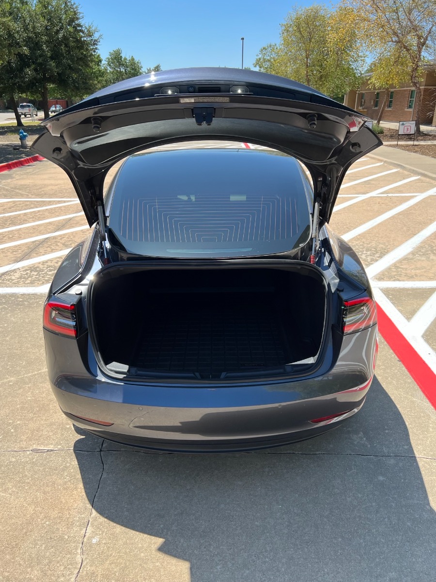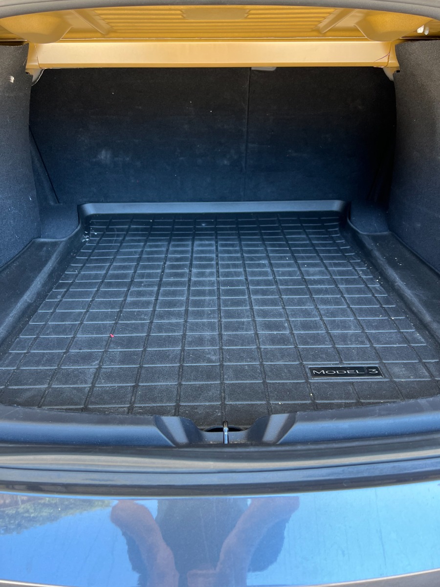 Aftermarket Telsa branded floor mats in front and rear. Tesla frunk and truck mats.