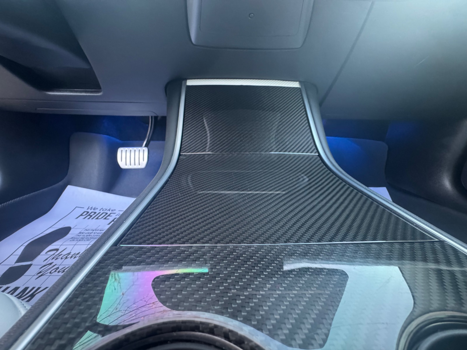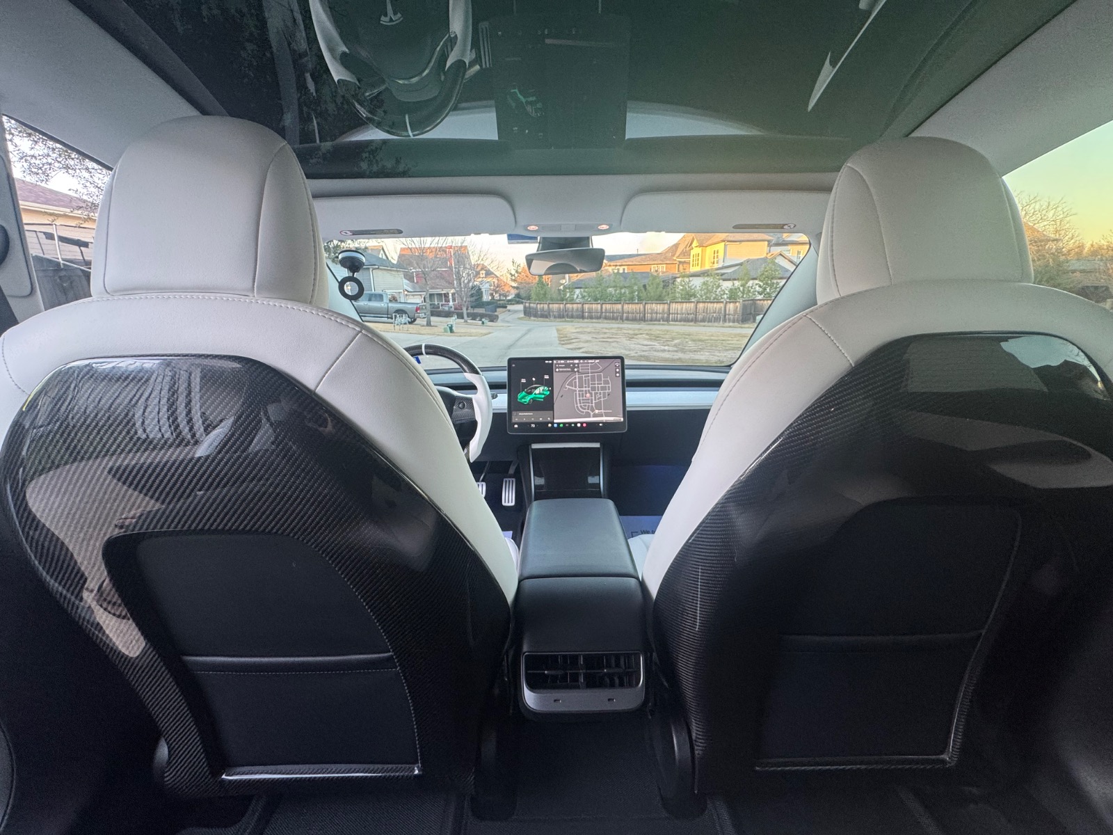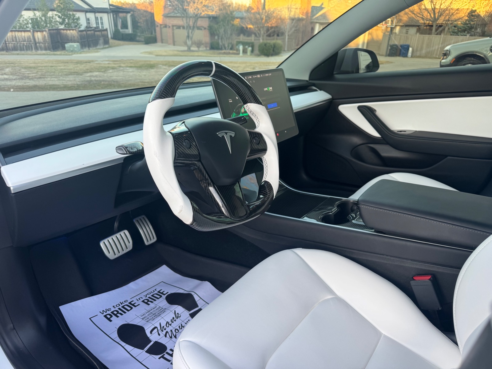 • Carbon Touchpoints: Genuine carbon fiber seat backs (replacing the factory plastic), carbon fiber “Model 3” door sills, carbon fiber window switches, and a carbon center console overlay.