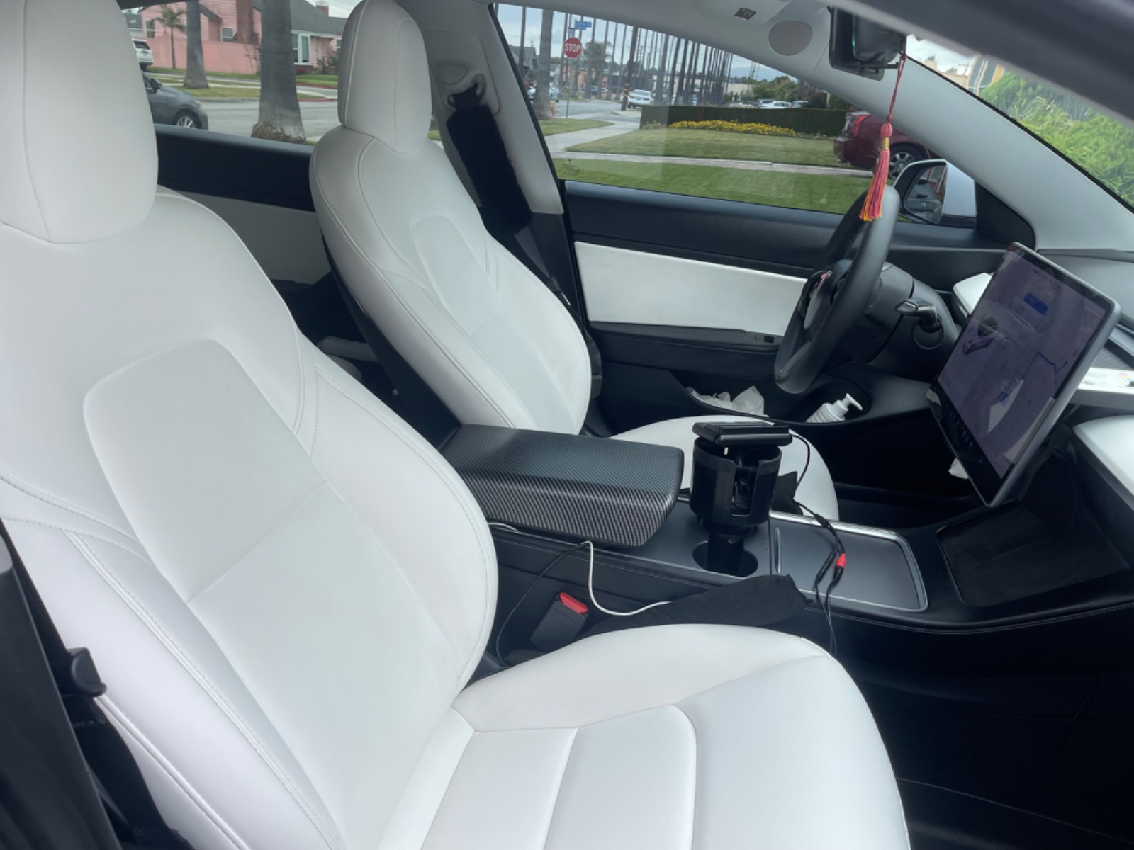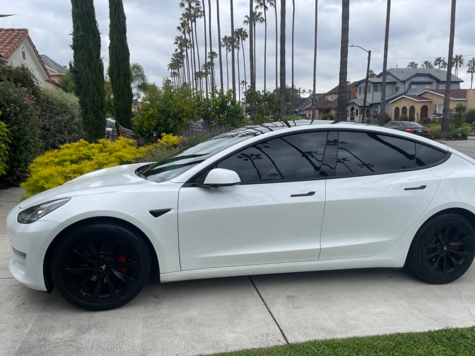 Amazing white on white Tesla model 3 standard range plus, with performance package exterior details: Tesla decal , carbon fiber spoiler, red brake caliper, sport rims, tinted windows.