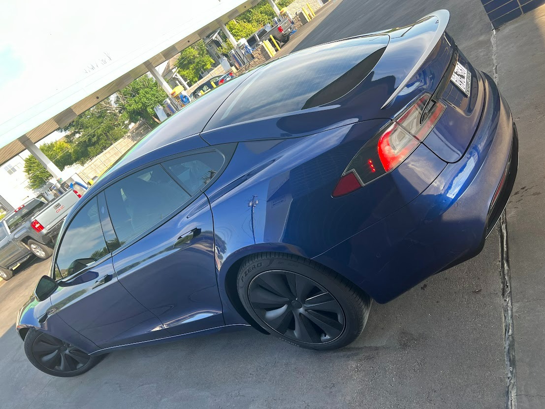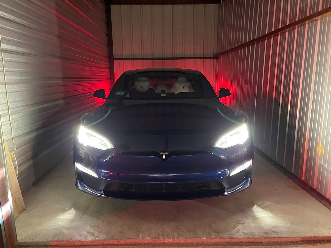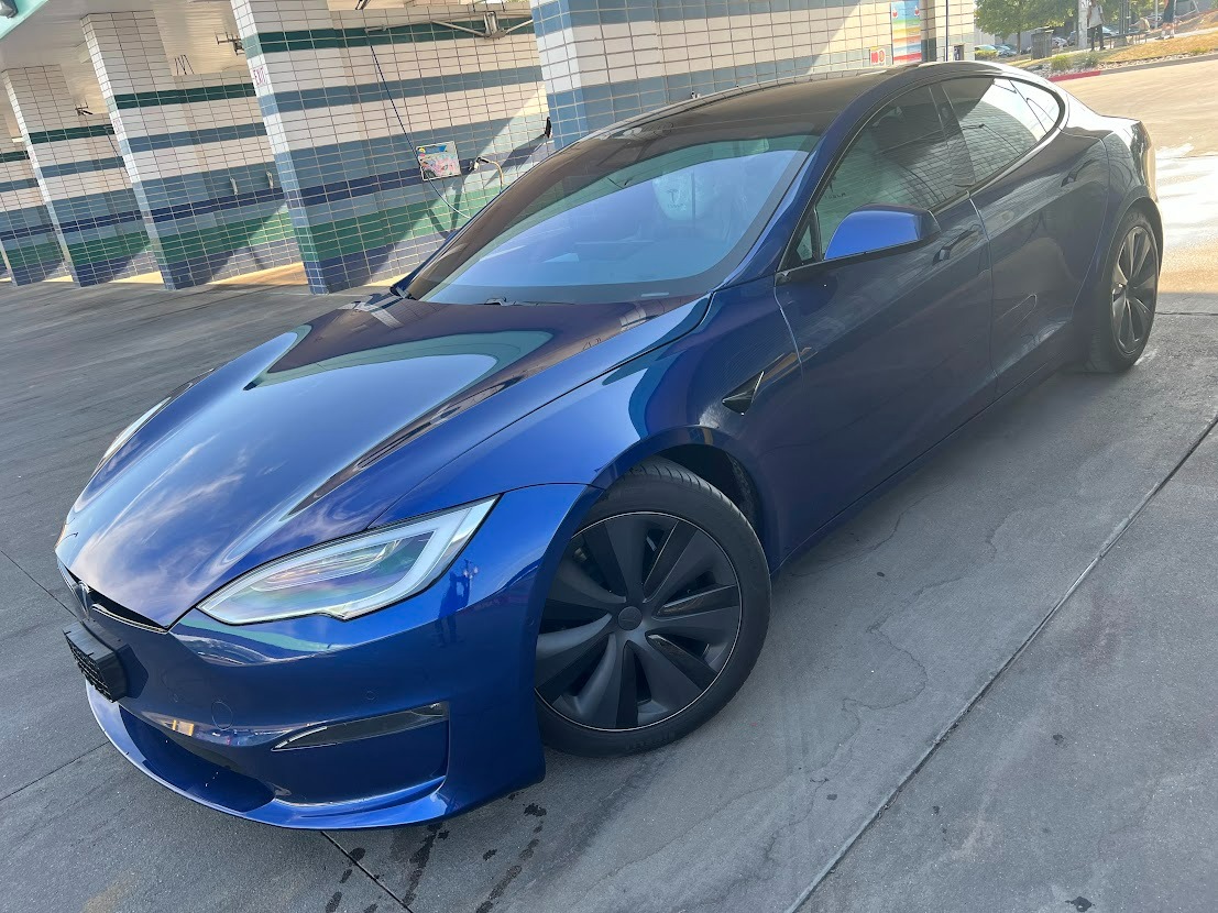 You’re looking at Matilda, a 2021 Tesla Model S Plaid, King of Sports Sedans. Dressed in Deep Blue Metallic paint on White Vegan Leather. Featuring the Tri Motor Electric 99 kWh battery producing a gut-wrenching 1020 HP, 1050 TQ (1.99 sec 0-60 mph; C&D 2.1 sec, qtr mile 9.4 sec @ 151 mph), and weights about 4766 lbs (2162 kg). It wears 255/45R19, 285/40R19 tyres matched with Matte Black 19″ Tempest wheels yielding 101/102/99 MPGe, [99.3-kWh] (Max 381 mi, Rated 396 mi vs 21” wheels 348 mi).