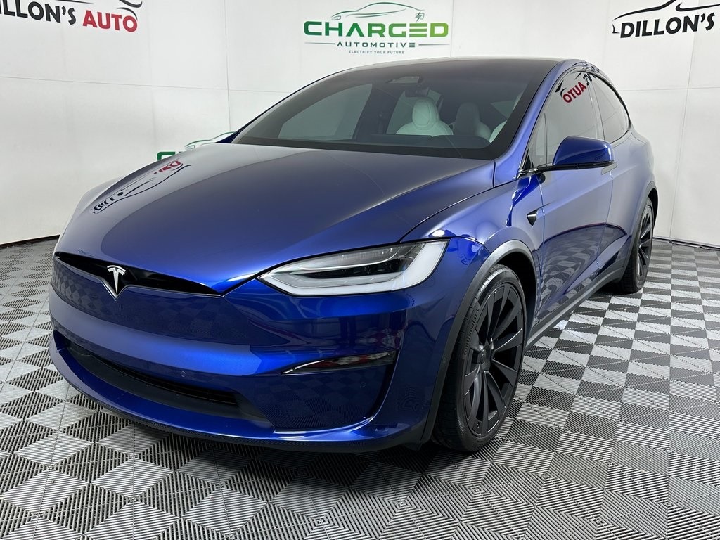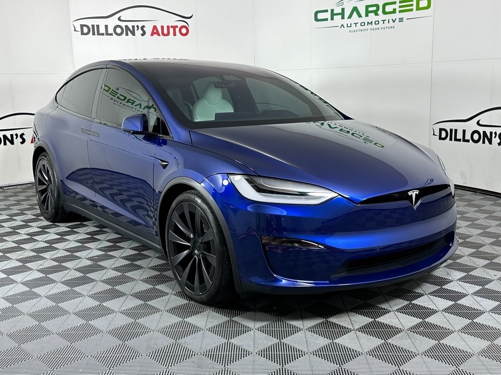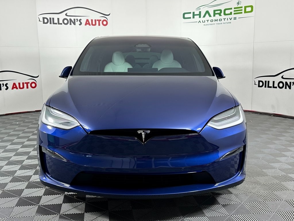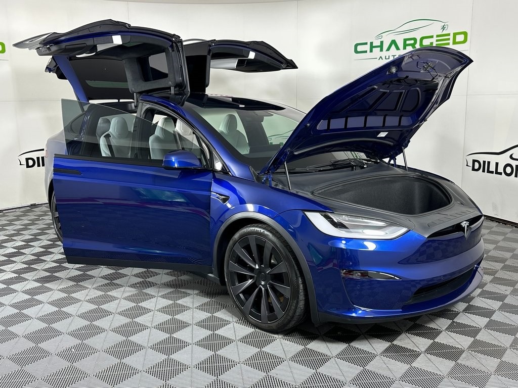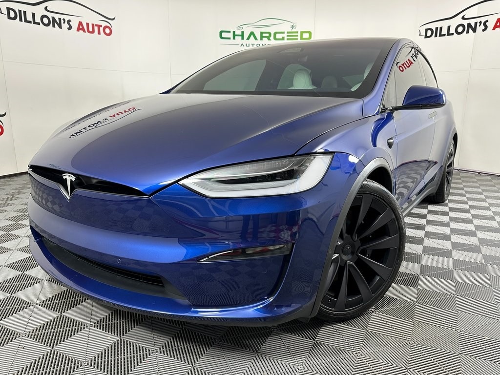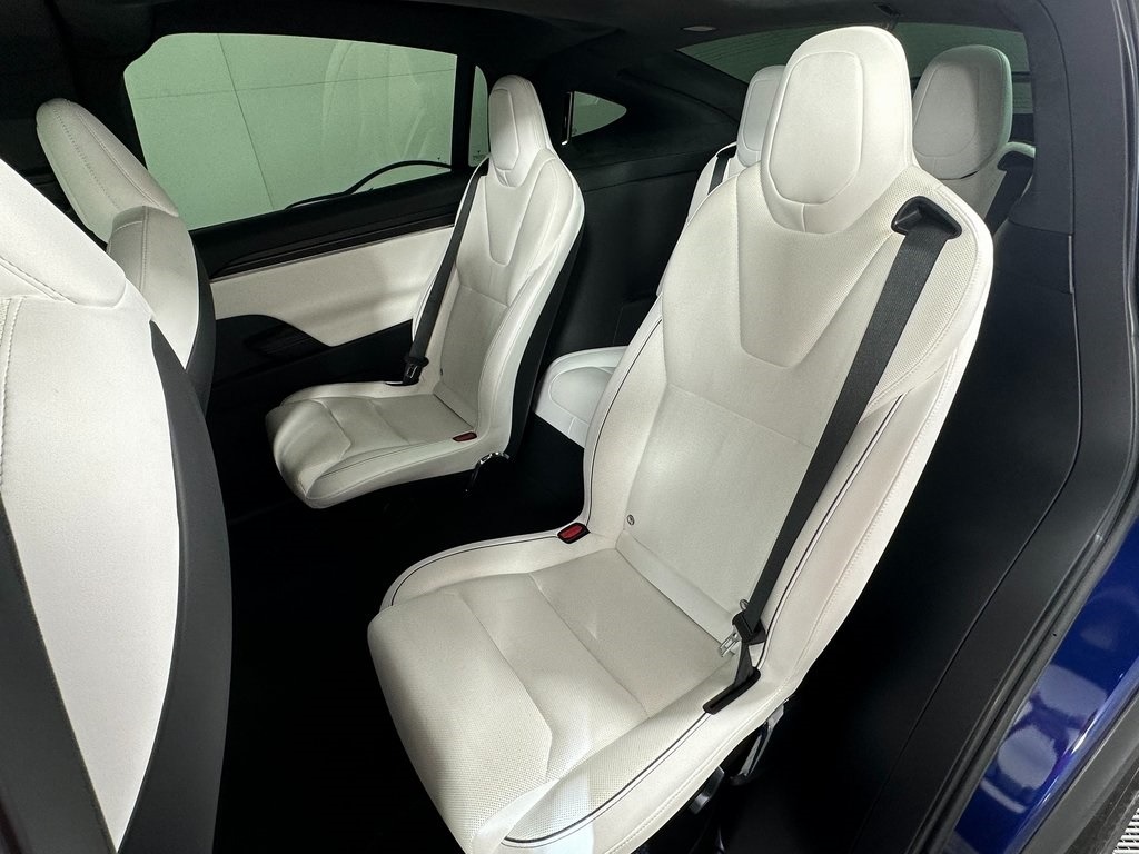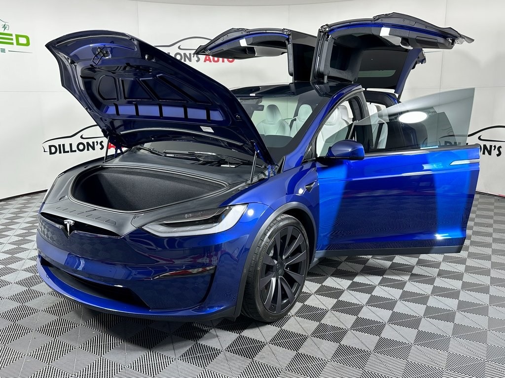 Blue 2022 Tesla Model X Plaid AWD 1-Speed Automatic Electric Motor Full Self-Driving Capability, Wheels: 22″ Turbine, White & Black Premium Interior.