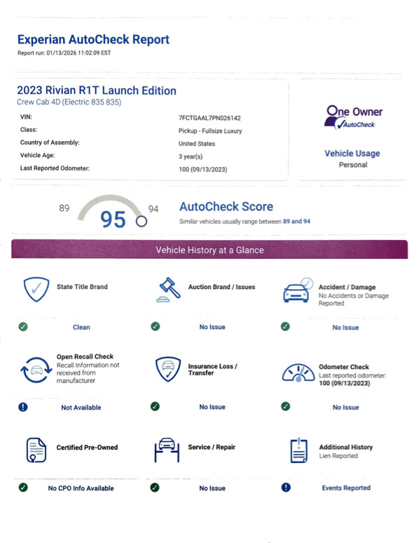 *Autocheck Vehicle History Report completed on 1/13/2026.