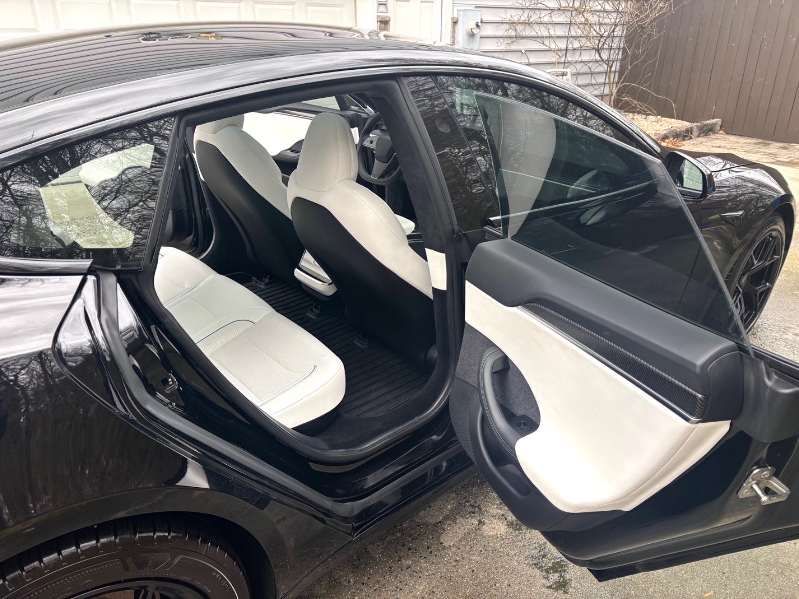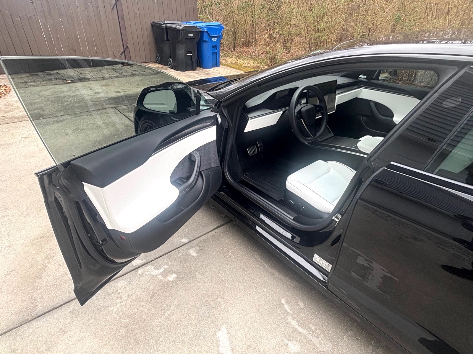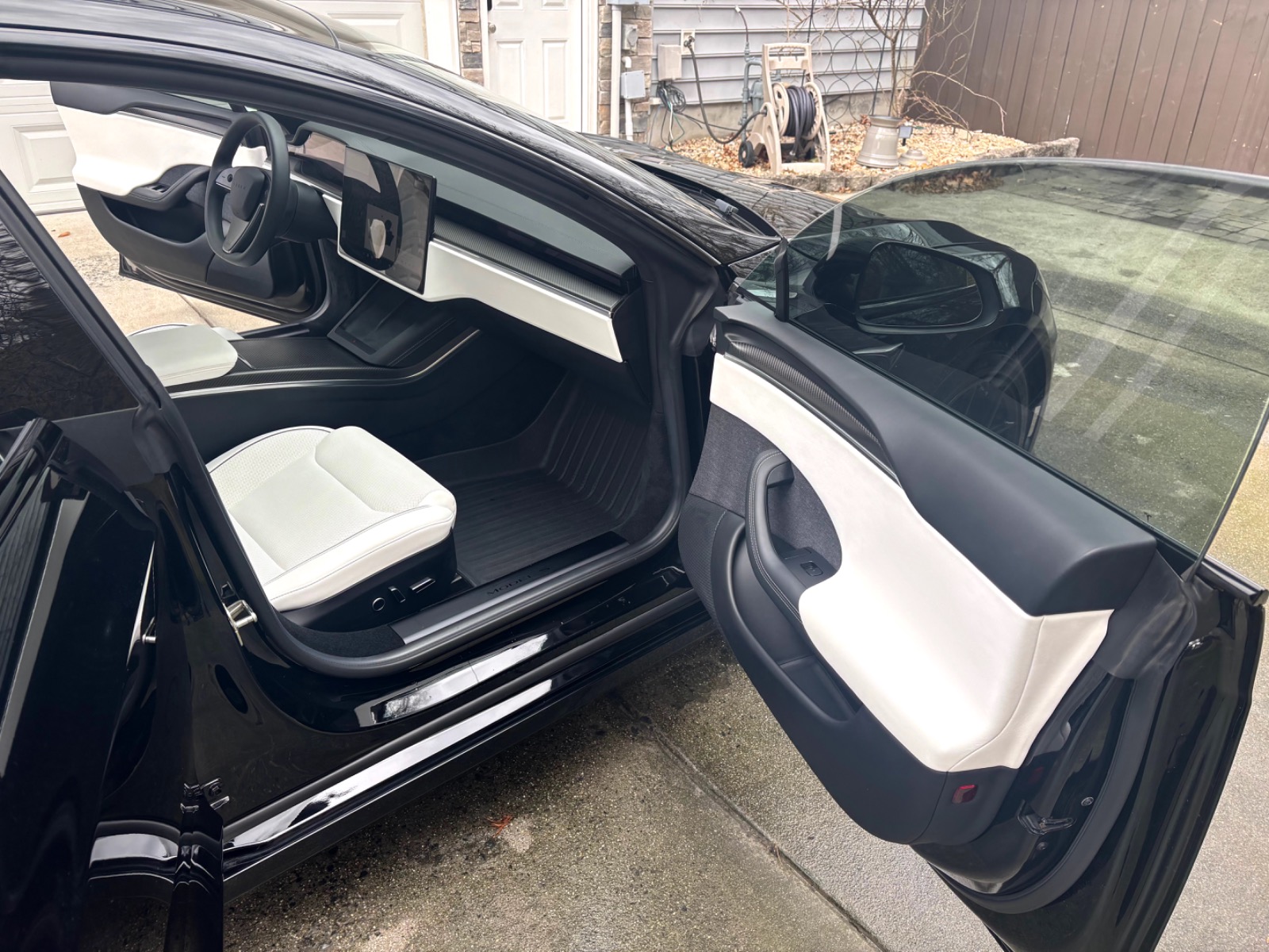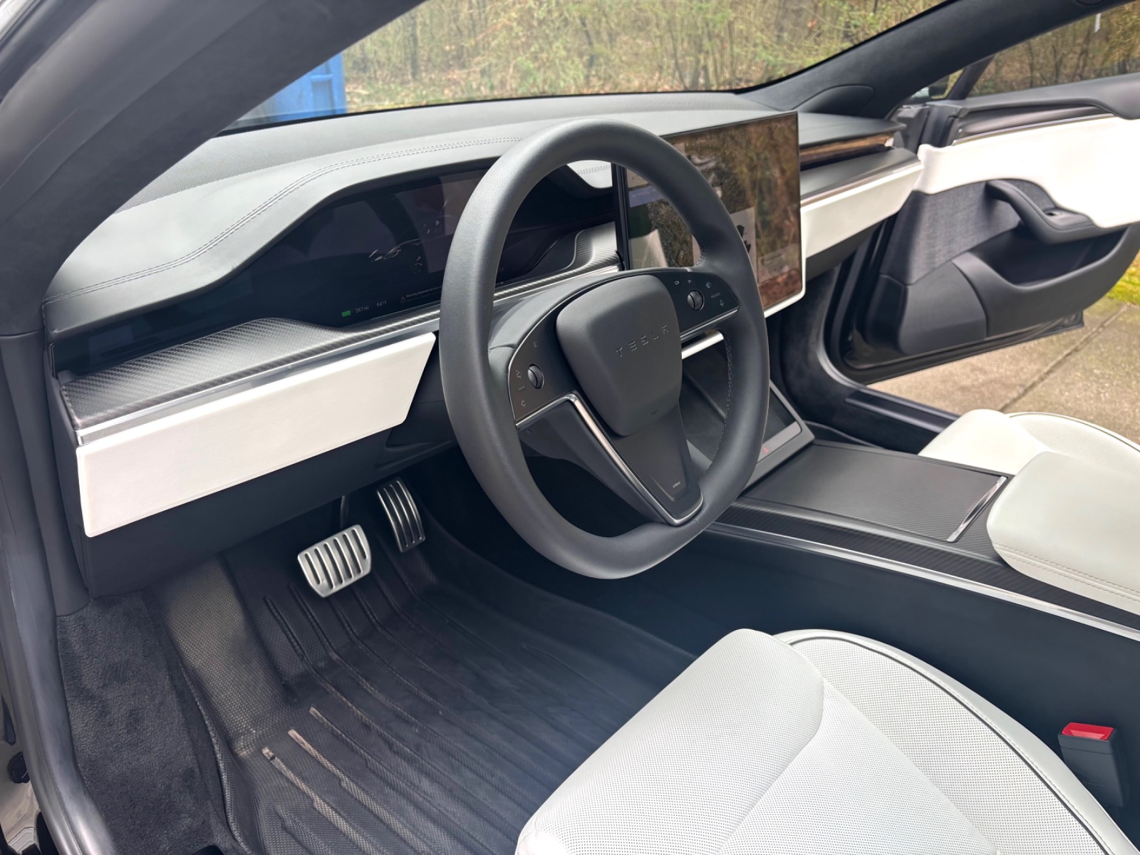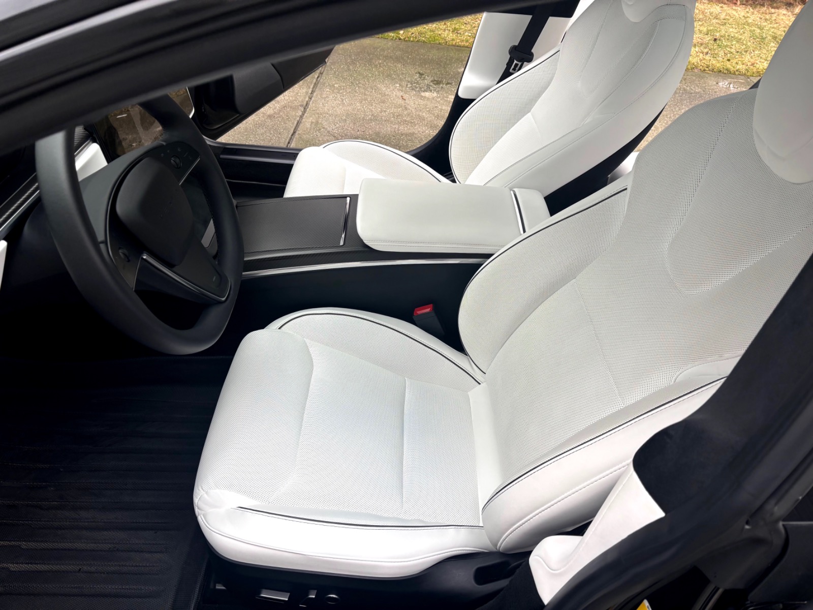 This Plaid comes with targeted upgrades that improve comfort, handling, efficiency, and autonomy. The driver’s front seat and rear seats were replaced by Tesla in 2025, returning them to full factory support and condition. It was upgraded from the original yoke to a round steering wheel in 2024, which delivers more precise and familiar steering feedback, easier parking and low-speed control, and reduced fatigue on longer drives for many owners. The aftermarket 19″ Satin Black Martian Wheels (MW05) Forged set measures 19×9.5 45 front and 19×10.5 45 rear, finished with matching black titanium lug nuts. These forged wheels cut unsprung weight compared to stock cast rims, sharpen handling and acceleration response, improve ride compliance over bumps, maintain or slightly increase real-world range/efficiency, and provide higher strength (JWL/VIA certified). Windows received professional tint in 2023 for privacy and interior UV protection.