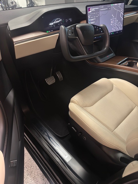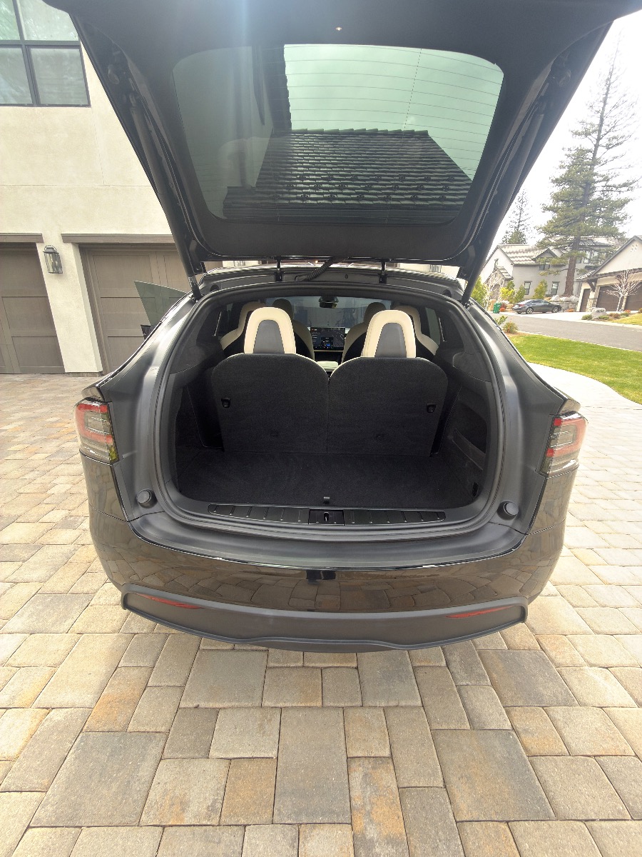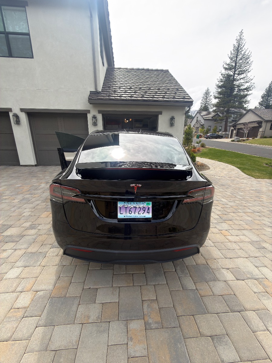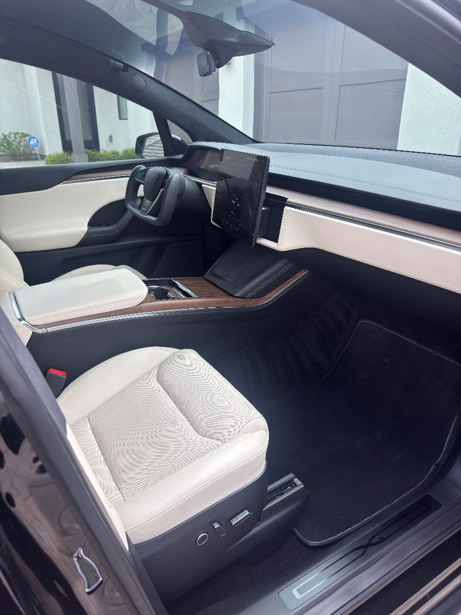 2023 Black Tesla X with cream interior. Very clean inside with only 26,500 miles. Picture above shows 308 miles at a full charge. New Michelin Cross Climate tires were put on in October 2025 at 24,245 milage. Front and side windows have UV tint from OC Tint Shop. Paid $116K (before tax and fees) which included the all black paint, 20″ Cyberstream wheels, cream premium interior with walnut decor, Yoke steering wheel, and six seat configuration and tow package. No accidents. Full self driving capable.