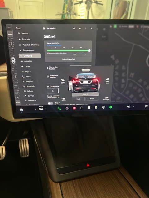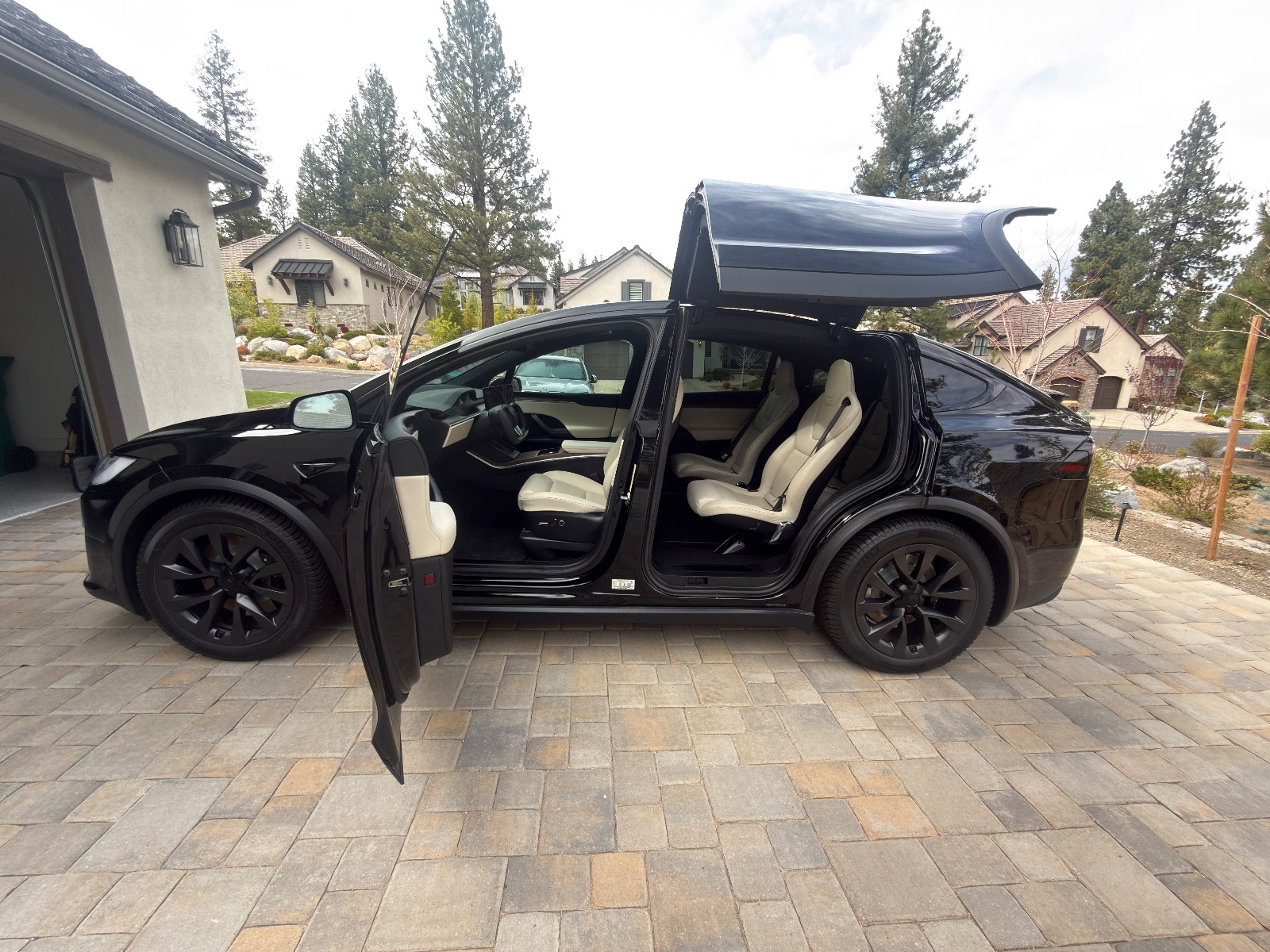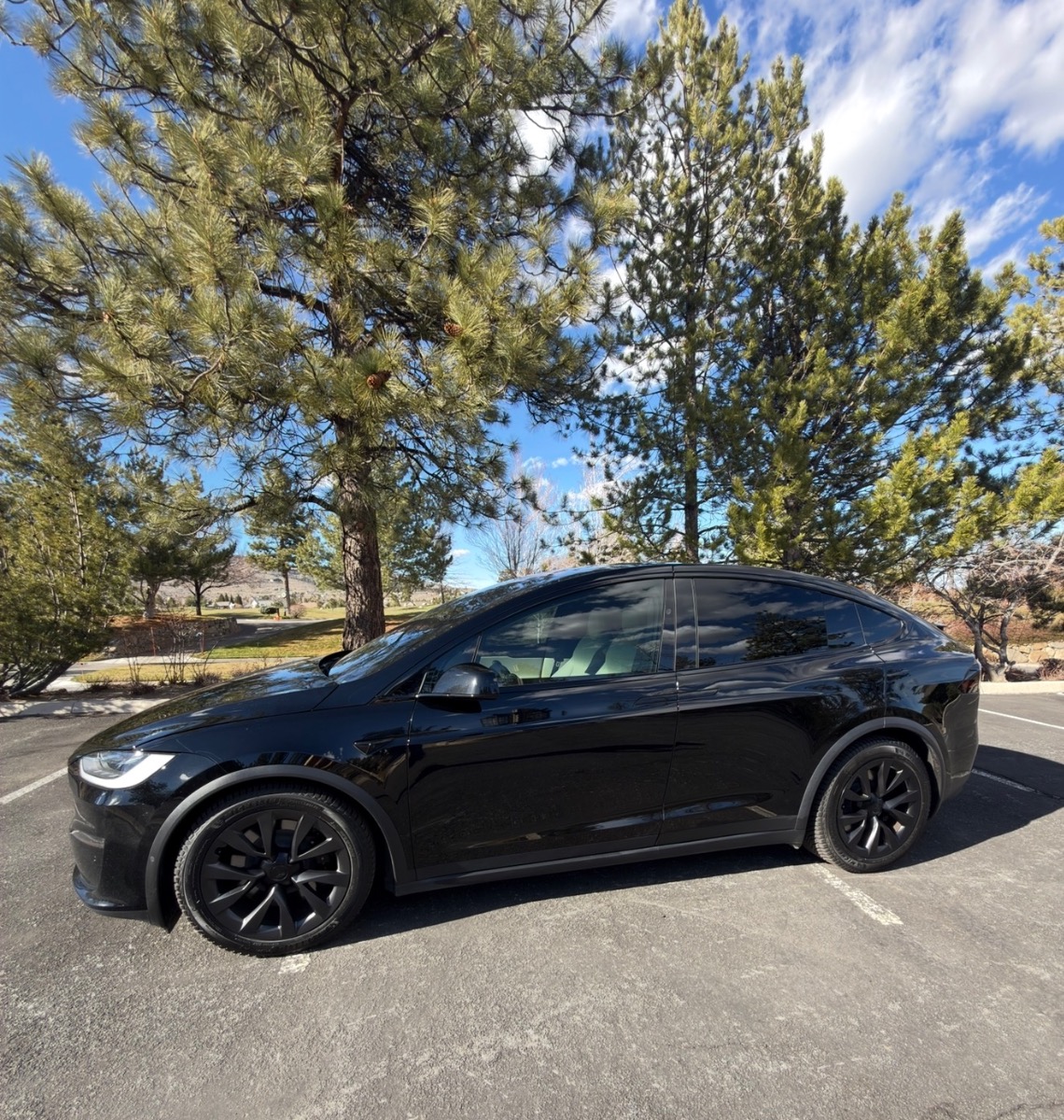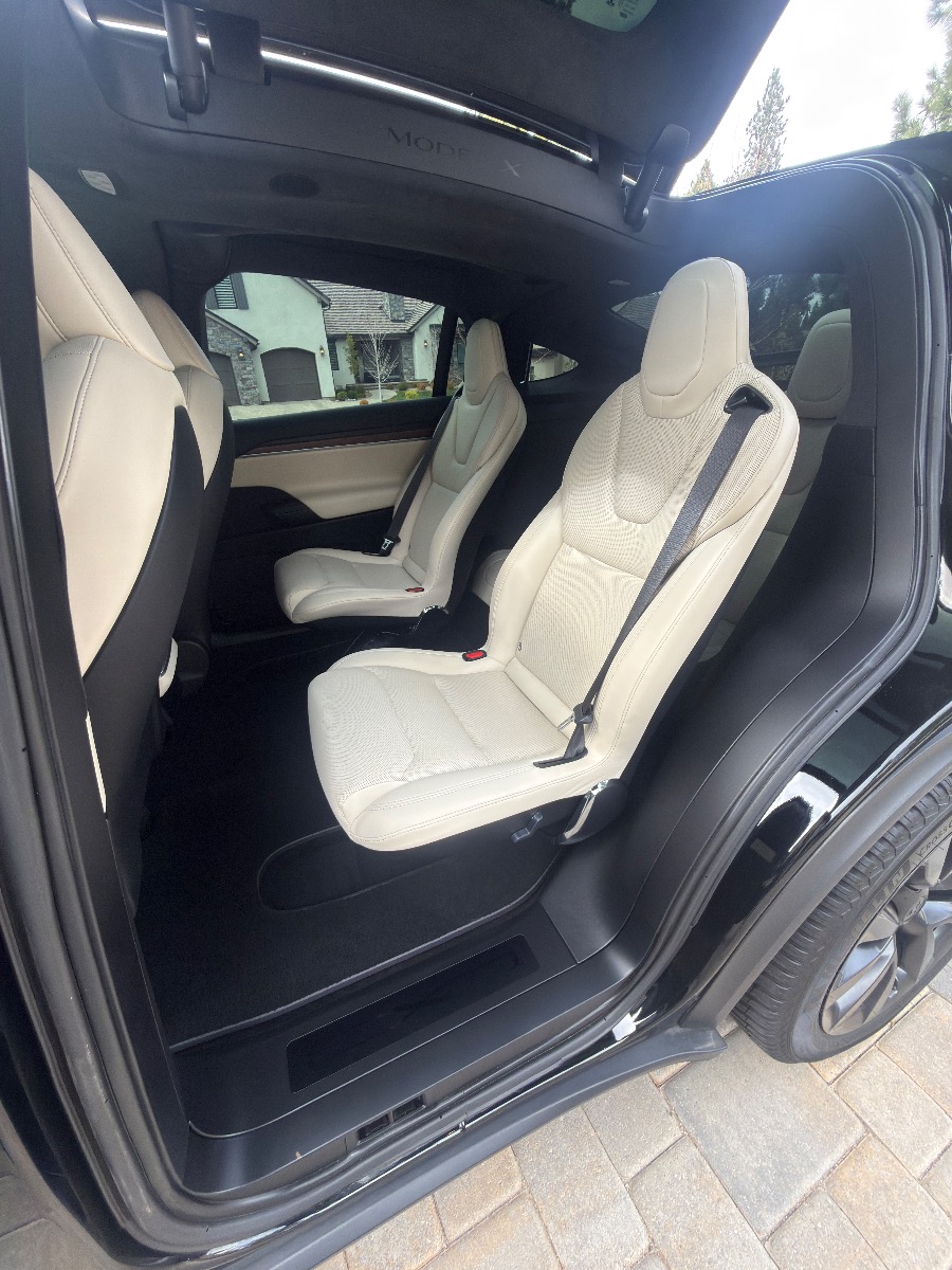 2023 Black Tesla X with cream interior. Very clean inside with only 26,500 miles. Picture above shows 308 miles at a full charge. New Michelin Cross Climate tires were put on in October 2025 at 24,245 milage. Front and side windows have UV tint from OC Tint Shop. Paid $116K (before tax and fees) which included the all black paint, 20″ Cyberstream wheels, cream premium interior with walnut decor, Yoke steering wheel, and six seat configuration and tow package. No accidents. Full self driving capable.