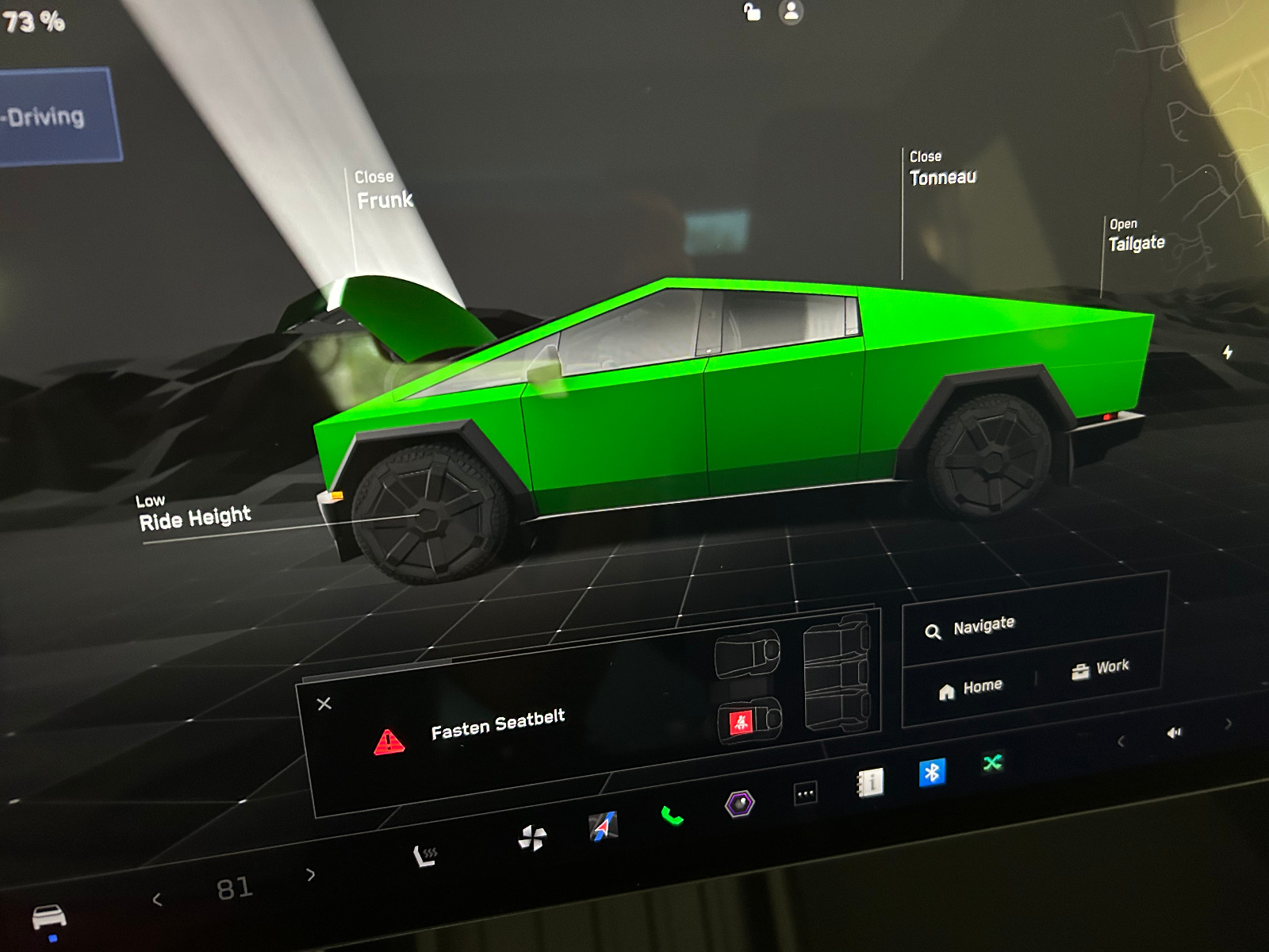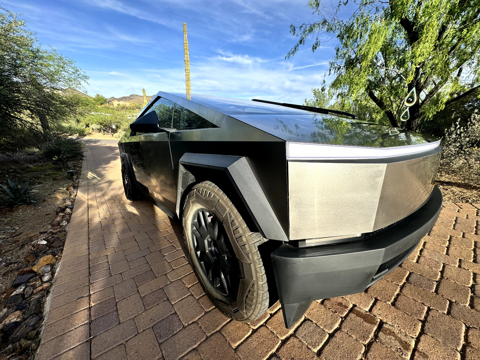 AWD, Cyber Wheel upgrade with AT 35″ tires, dual engine. Private sale, no destination fees or other dealer fees, I already paid the 9% sales tax. You must feel the power and luxury of driving CyberTruck.. Tough, but smooth, quiet, no vibration. No accidents, no mechanical isues, clean title. Tough, hard, secure, pickup bed cover (tonneau) opens completely out of way of bed and closes at push of button. Garage kept, nearly all charging is from standard wall outlet. Interior clean, no perfumes, smoking, food, animals. Variable truck ride height is selected by you or auto-based road type and location. Maximum high window tint. Solar shade for panoramic roof, although the glass glaze is effective. Back seats and back leg room are large and cabin is comfortable for 5 adults.