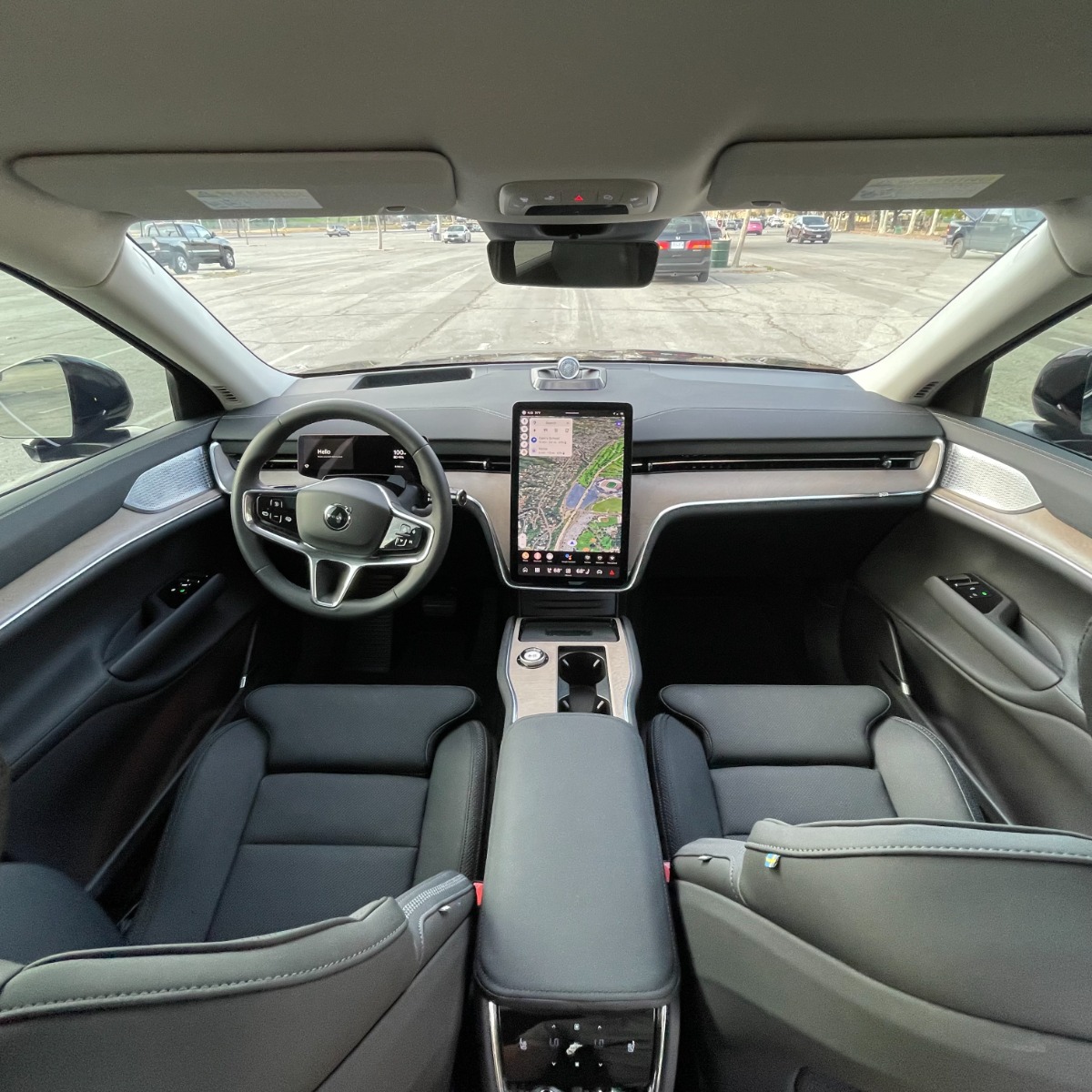 Tesla-like interior, with large central touch screen (with apps) and minimalist but functional and comfortable decor. There is also driver display.